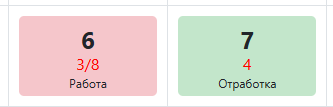 В календаре на рабочем дне отображается количество отработанных за день часов (в примере - 3 часа), а через черту - общее количество часов, которые необходимо отработать за этот день (в примере - 8 часов).