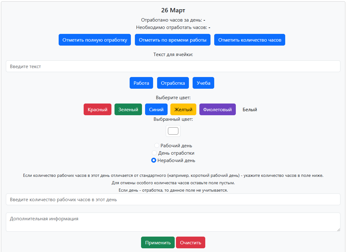 Календарь позволяет вести учет рабочих часов в удобном формате.